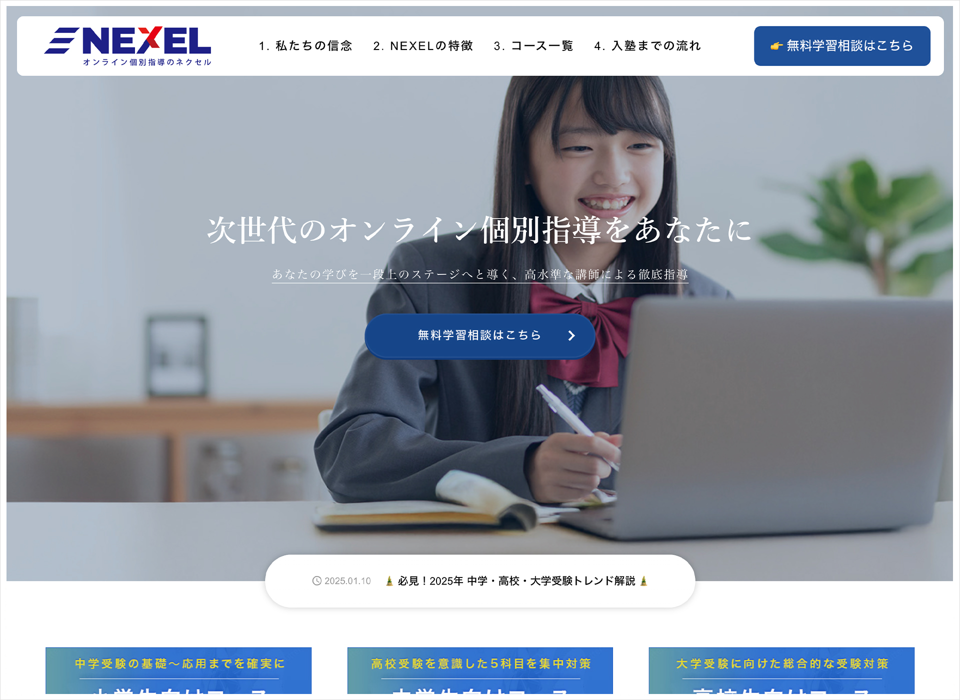 オンライン個別指導の学習塾を運営されているNEXEL様のサイト制作に携わらせていただきました。設計からデザイン、コーディング、ライティング、WordPress実装までの全てを担当いたしました。