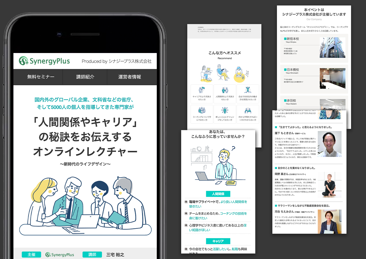 人間関係やキャリアについてのオンラインスクールサービスを提供されている株式会社ホリズム様のLP制作に携わらせていただきました。デザインとコーディング実装を担当いたしました。