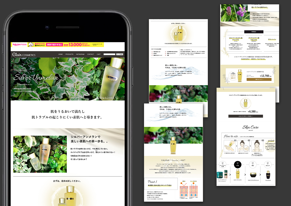 楽天ECサイトで化粧品通信版倍を行っている自然美生薬株式会社様のLP制作に携わらせていただきました。デザインとコーディング実装を担当いたしました。